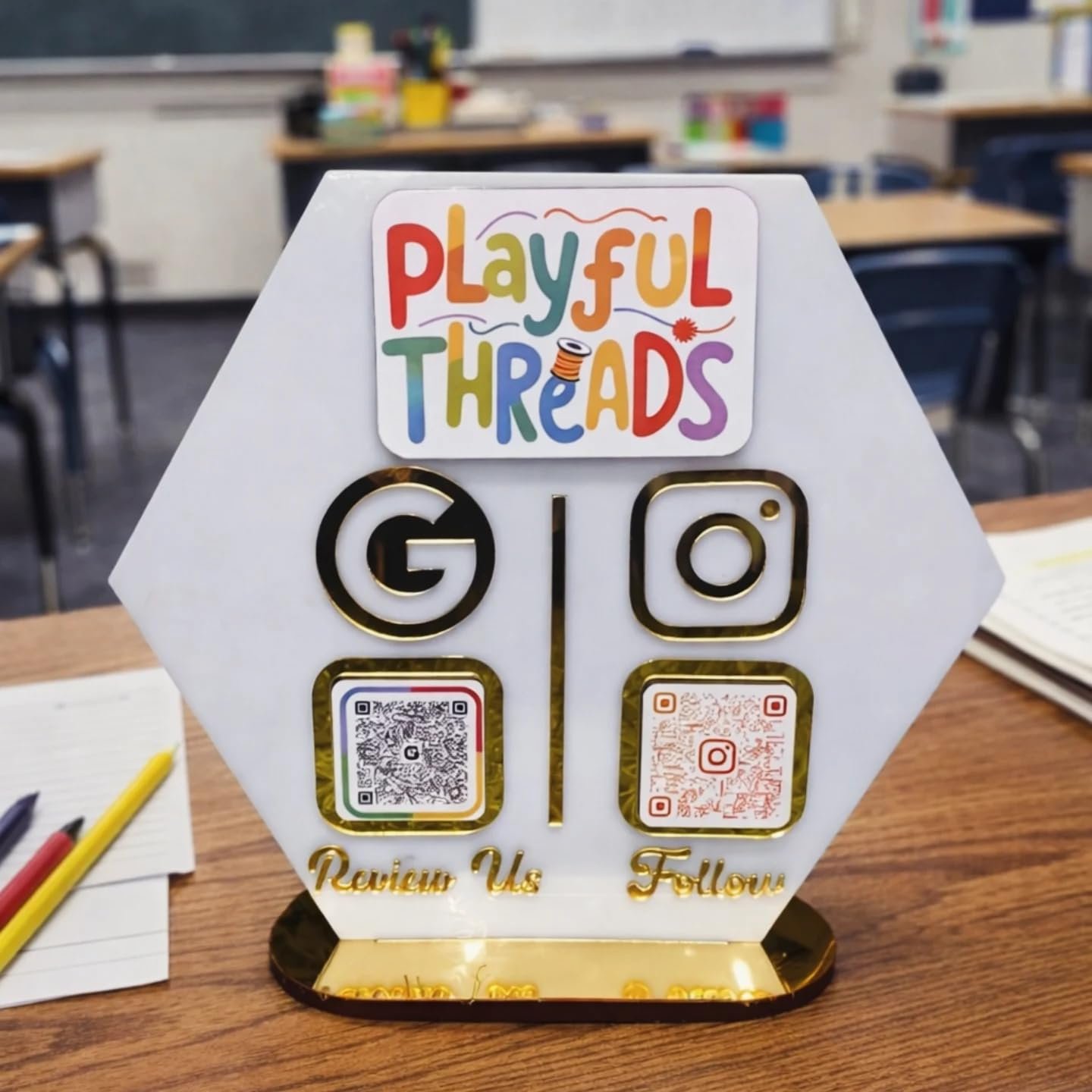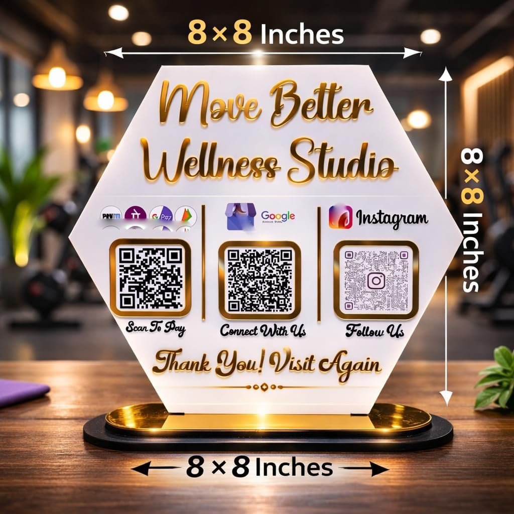 Unique Acrylic QR Code Standee with Gold Base | Google Review, Instagram, & UPI Payment Display | Item Stand (Size- 8 x 8 inches)